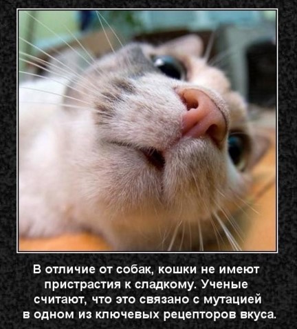 Тут речь идет о еще одном гене, который отвечает за вкусовые качества. У кошек он просто отсутствует, они банально не могут понять вкуса сладкого. Для них это всё равно, что жевать бумагу, поэтому пытаться накормить своего питомца конфетами не стоит и пытаться. Даже если кошка проглотит лакомство, она всё равно не поймет, что это было.